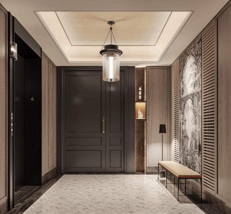 门口是相对独立的门厅 ,业主乘坐电梯直达所在楼层后,出门就是自己的私人空间,回家的仪式感拉满了。