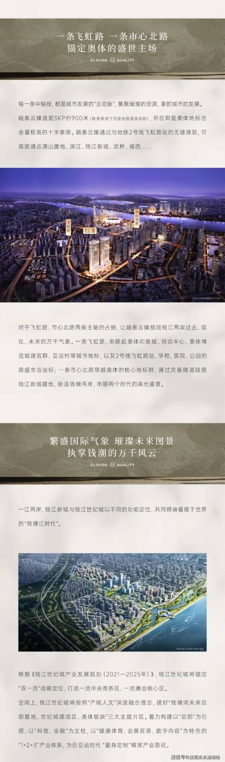 融泰云臻不仅是位于市心路上,距离SKP仅900米,窗景就是杭州「海拔」最高的城市封面,而且还是市心路和飞虹路的十字路口,不仅拥有270度的城市景观,而且还是地铁2号线飞虹路站的上盖,地铁出口可以直达融泰云臻的地下室。