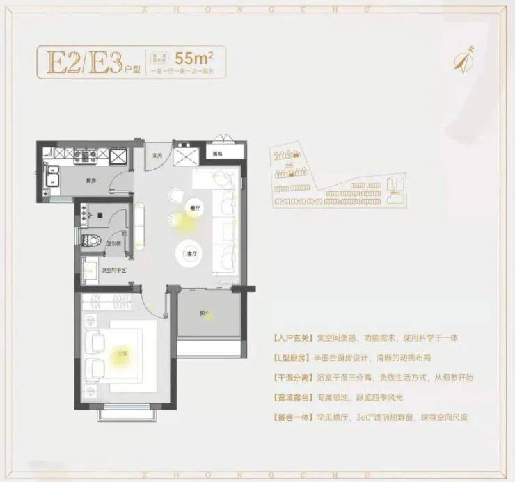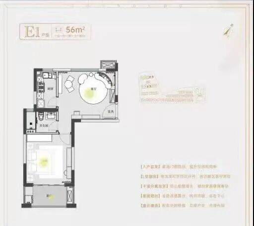 建面约55㎡1房1卫户型,低总价优质上车小户型,做到了双开间朝南+卫生间干湿分离+卧室带飘窗+客餐厅相连,小而美的一个户型。