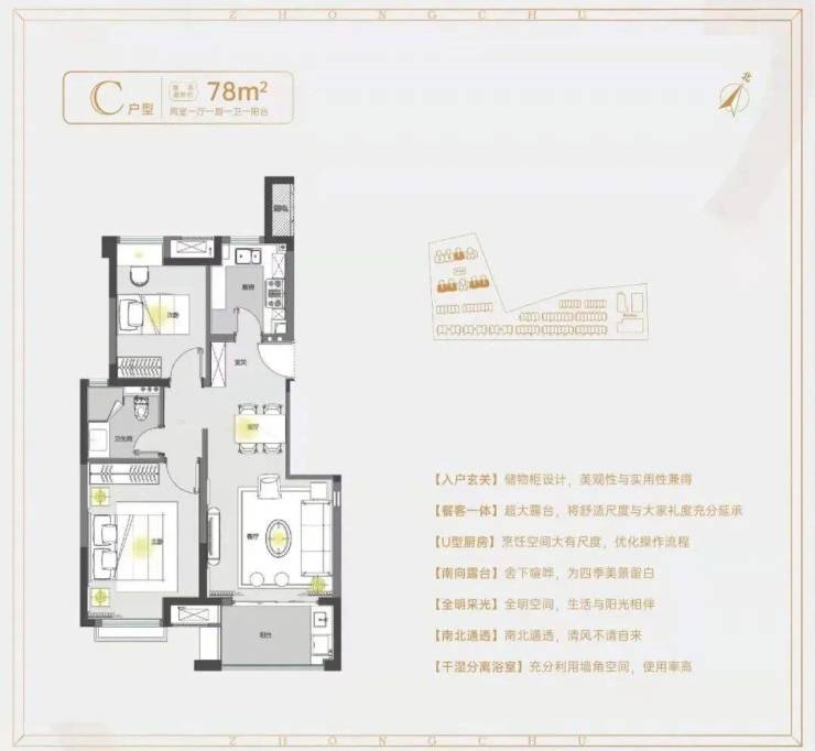 建面约78㎡2房1卫户型,做到了双开间朝南+南北通透+卧室带飘窗+动静分离,功能区划分、动线都非常清晰。