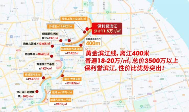 事实上,直线距离黄浦江约400米的新房本就寥寥无几,而这片区域的新房均价普遍达到18-20万/㎡、总价3500万起;而保利誉滨江不仅能跻身400米临江的稀缺阵营,更是这条线上卖一个少一个的“11字头”新房,总价更显温和,性价比优势突出。