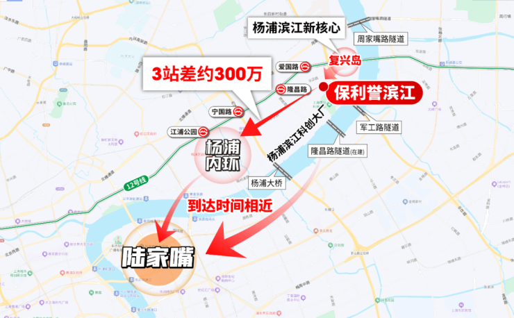 另一方面,杨滨新盘大部分配套共享,去往浦东、陆家嘴的时间也相差无几,但保利誉滨江价格是实打实有竞争力,比杨浦内环同面积段产品足足有约300万价差,无需拉太多杠杆置业杨浦滨江芯。