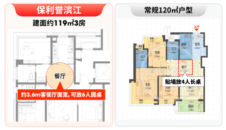 建面约119㎡户型,客餐厅面宽达约3.6米,区别于常规户型只能贴墙放4人长桌的局促,这里可从容摆放6人圆桌,逢年过节全家聚餐,再也不用“挤着吃饭”;