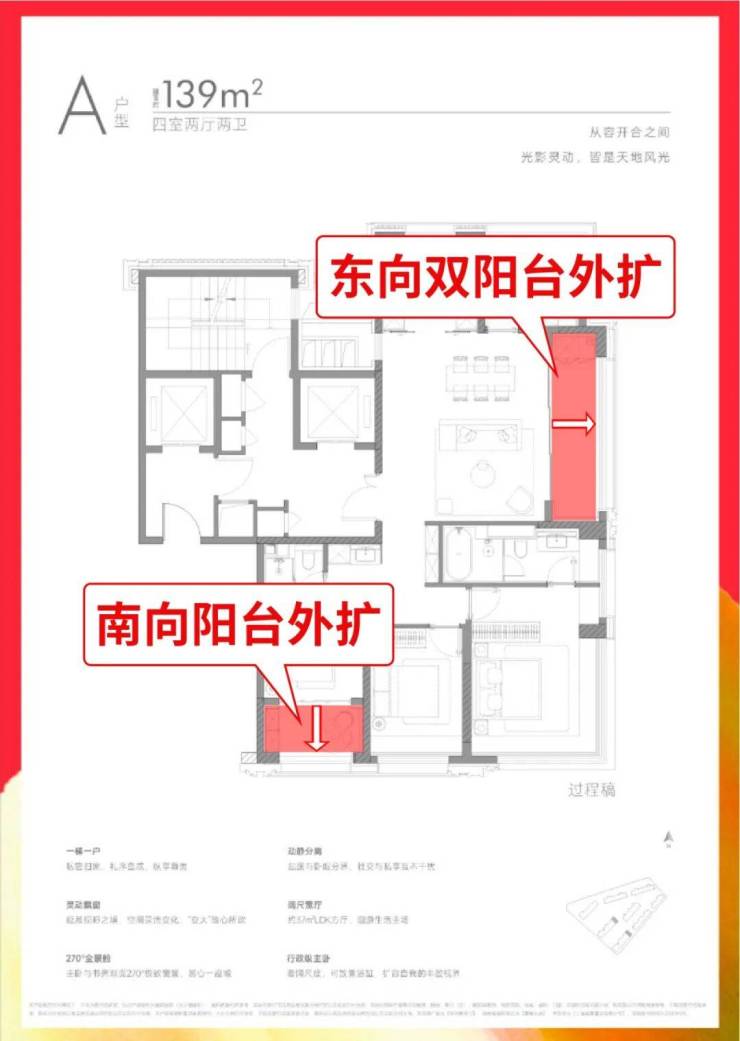 边套标配270°无柱飘窗,部分南北双270°飘窗。特别建面约139㎡户型,大阳台+满飘窗的组合,直接打开全景舱视野。