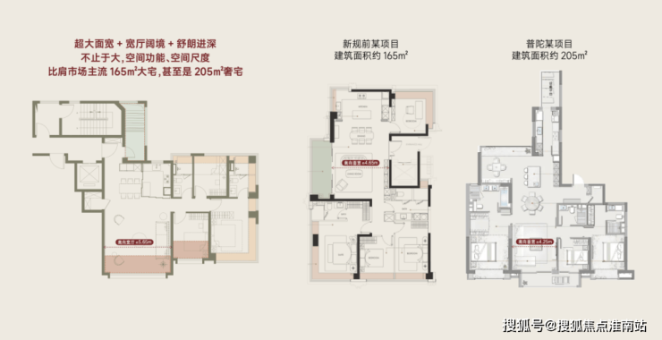 ·超阔客厅尺度,收揽阳光和风景:约5.6米的南向巨幕客厅面宽,是什么概念?这是市场主流豪宅的宽奢尺度了,让我们对比一下,以下165㎡、乃至是205㎡户型尺度,能更直观的感受这个户型的悦级尺度。