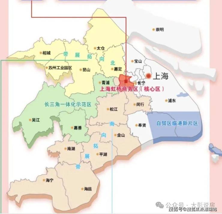 ➤“两带”是以虹桥商务区为起点延伸的北向拓展带和南向拓展带。其中,北向拓展带重点打造中央商务协作区、国际贸易协同发展区、综合交通枢纽功能拓展区。