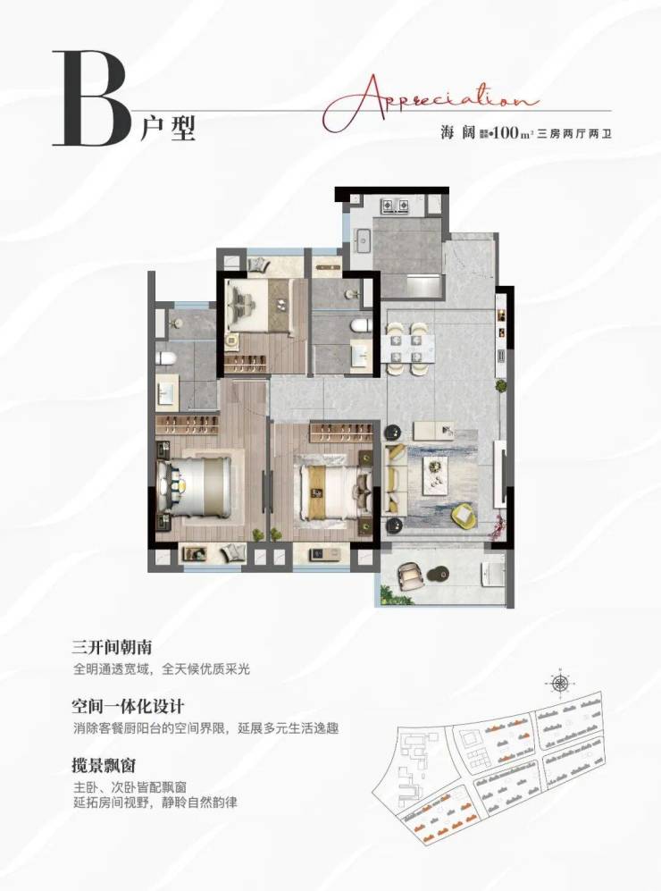 市面上多数项目,往往只把优质景观留给大户型,而本次加推的建面约100㎡户型,位于社区首排,享受到一线无遮挡海景,妥妥王牌户型,推窗即是绝美海岸线,视野通透又开阔。