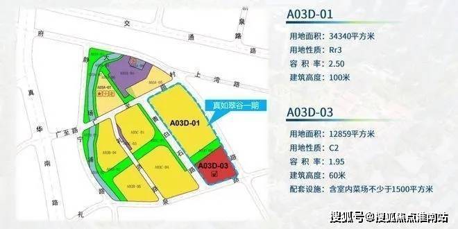 A03D-03地块:出让土地面积12859平方米,土地用途为商业,规划容积率1.95,计容建筑面积25075平方米。
