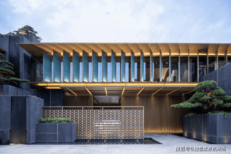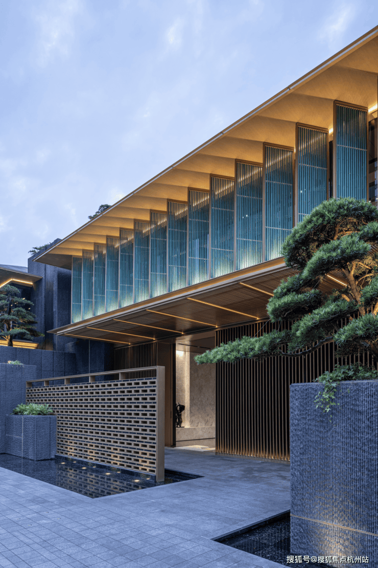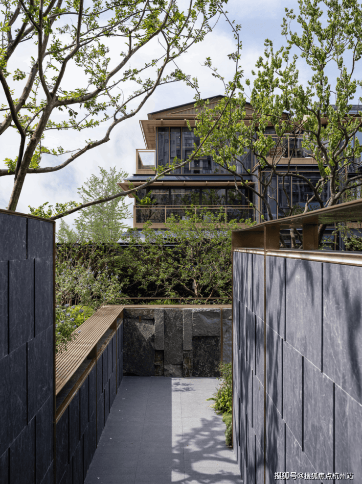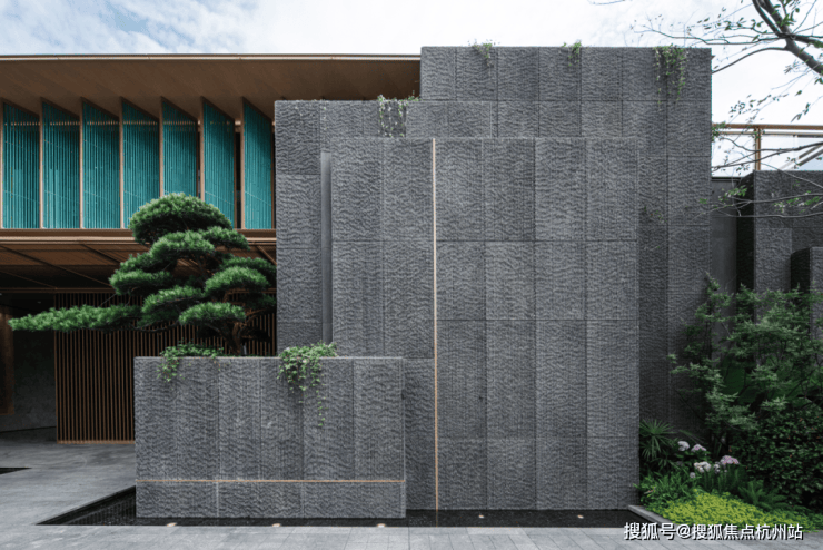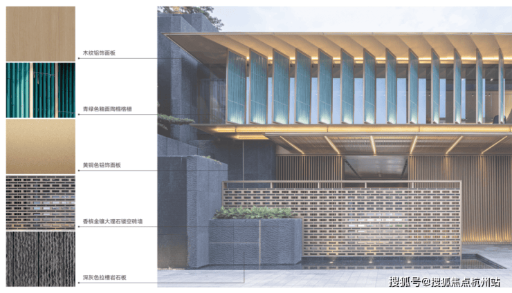 外立面:新疆紫罗兰石材 + 青瓷屏扇,耐磨损、质感佳