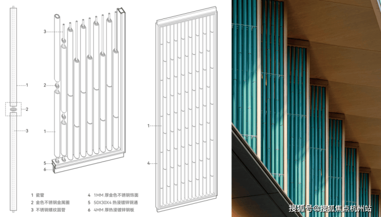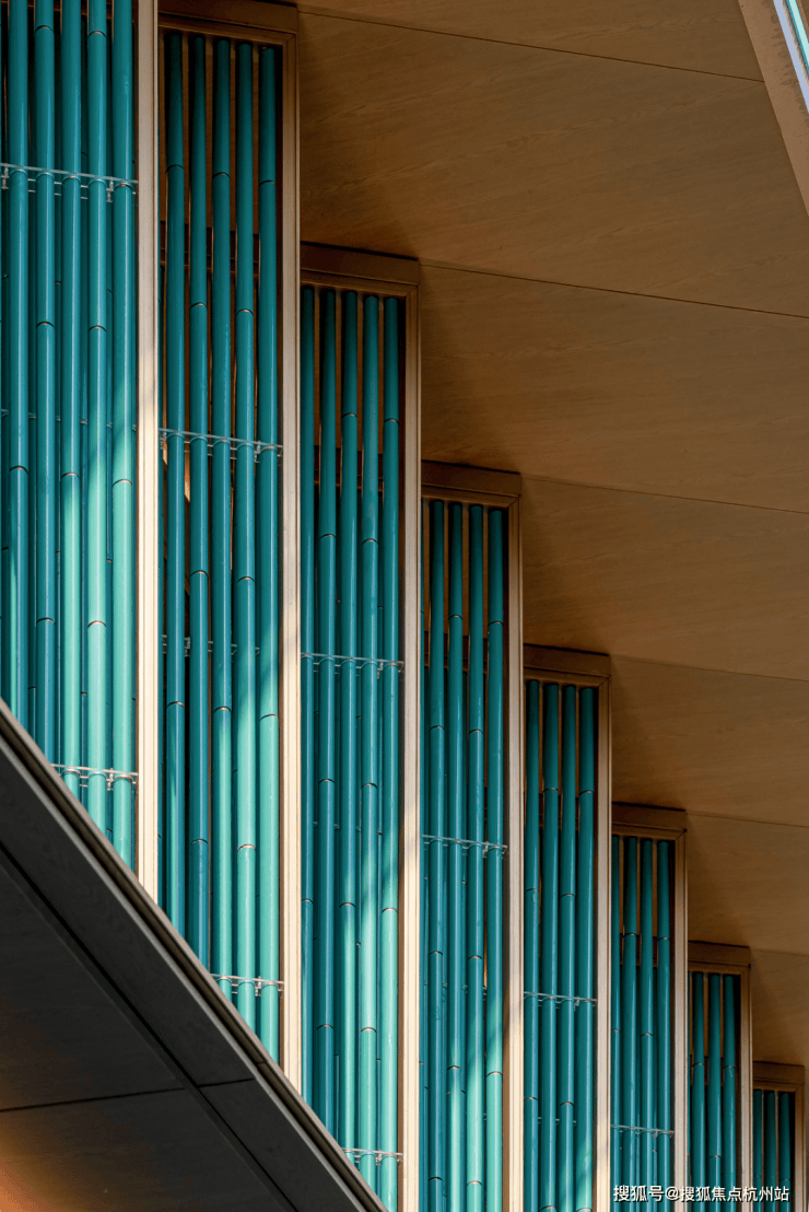 青绿色瓷管经过多轮选材,最大程度保留青瓷的典雅质感,确保在自然光线下呈现温润的意境。金色型材作为点缀,镶嵌于建筑细节中,也增添了视觉层次和精致度。