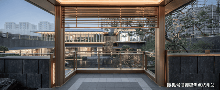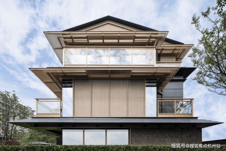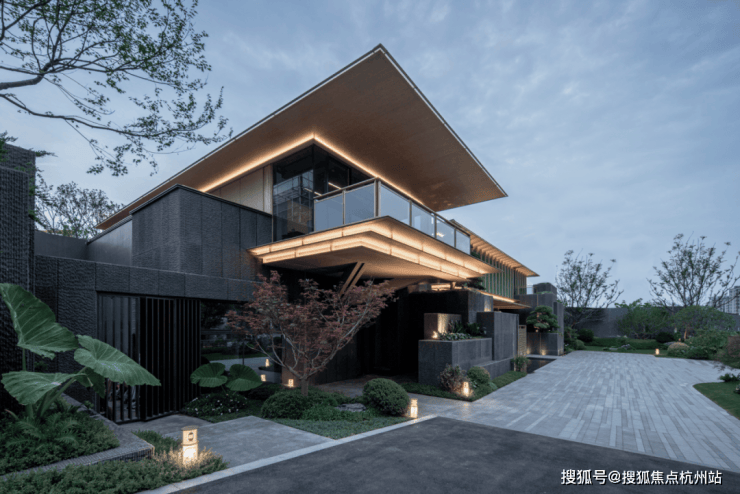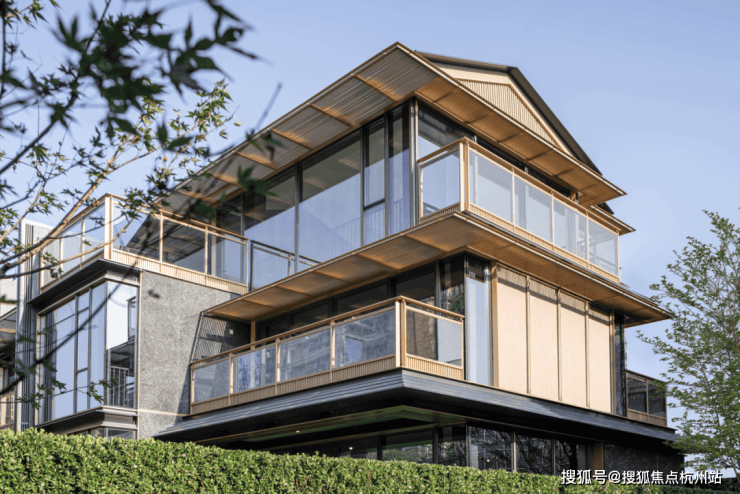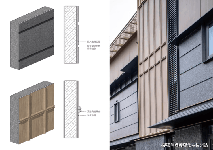 院墅的立面材质选择石材、铝材、玻璃为主体,辅以仿木纹涂料并嵌入发泡陶瓷线条,通过木作样式与木质质感的饰面表现,增添构造的层次感与品质感。