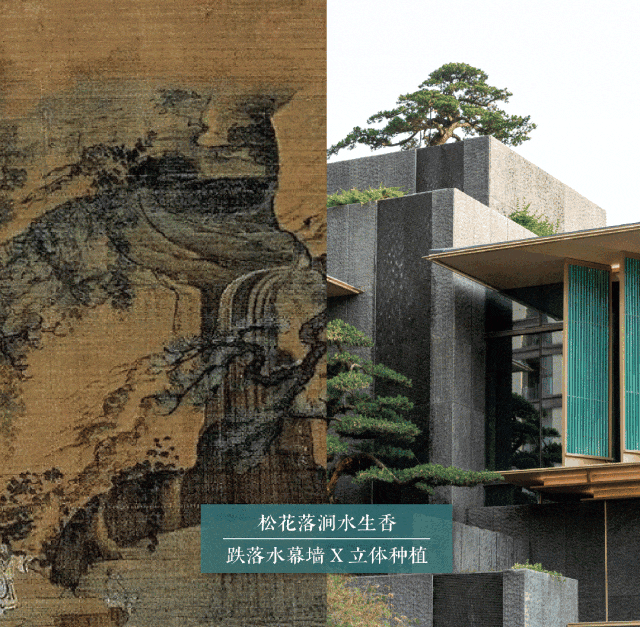 “石”,选择黑金砂是因为我们想要还原画作中的皴染技法。经过光面、毛面、荔枝面、自然面等多轮试样后,最终选择了凿毛拉槽的表面处理方式,来回应自然界的粗粝的山石质感。