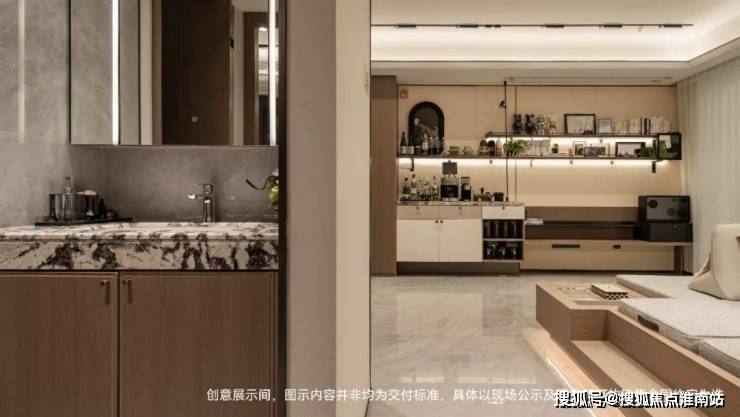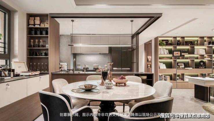 细节上,餐厅飘窗上的柜子是交付的;岛台靠餐客厅一侧也做了开放式的收纳,配了升降插座;