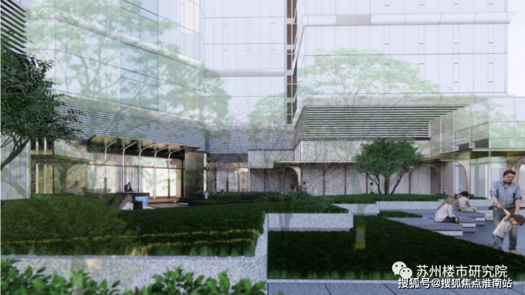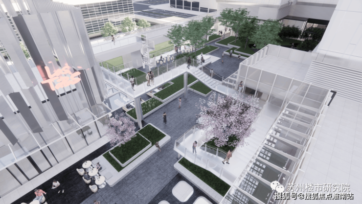 三座塔楼以植物为核心设计元素,在楼栋之间形成一整片绿色区域,呼应苏州当代城市肌理,将商业水岸、花园水岸、临街活力区和屋顶花园等绿意映衬在建筑设计之中,打造摩天大厦中的垂直花园。