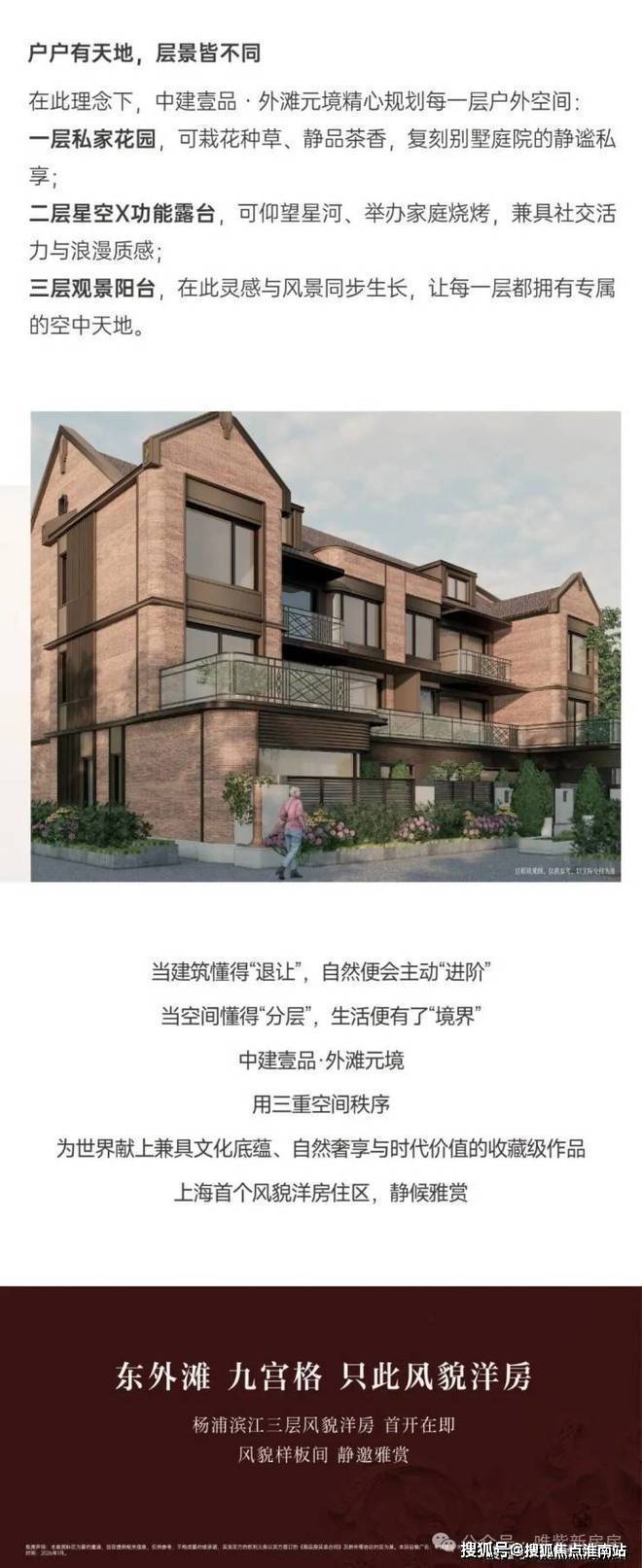 像打造艺术品一样,打造洋房新物种: 每一座风格独特、宜居舒适、令人向往的洋房都在证明,最鲜活的居住文化永远是进行时。好房子,不仅是供人品鉴的艺术品,而且能给居者带来曼妙且美好的时光之旅,通往 “世界性与本土性共存”的大门。 而中建壹品 · 外滩元境,是值得臻藏的好房子,是稀世存在的风貌洋房。