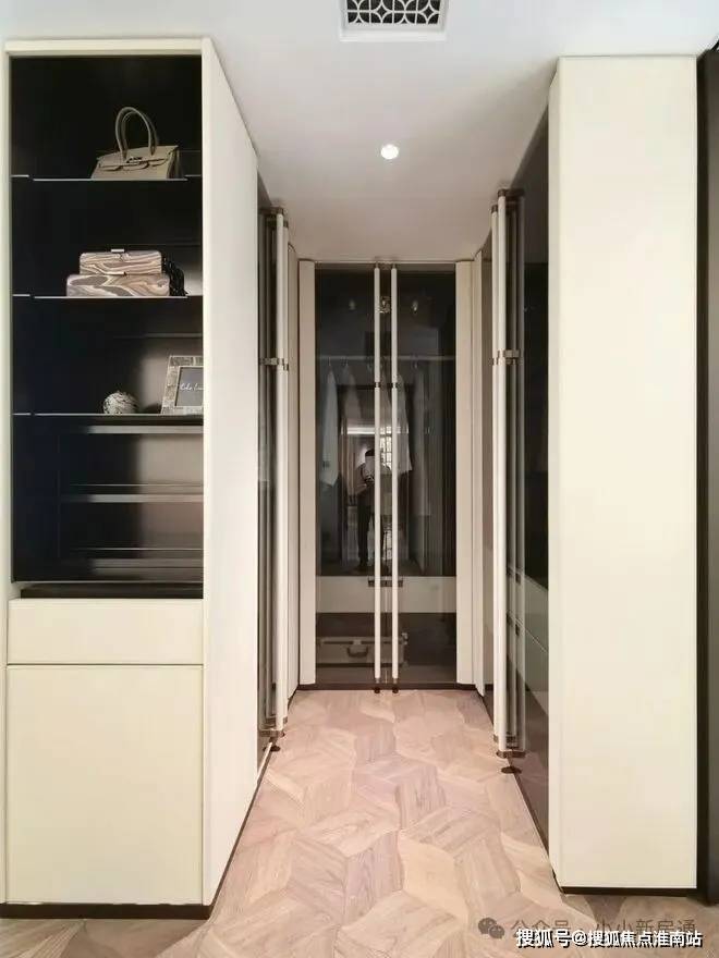 通过示意图我们会看到,一般项目的玄关柜处于成本原因只会做到下图中间位置的冰箱位置就结束,而外滩源著在标配的双开门冰箱(小户型博世或同等品牌、大户型利勃海尔或同等品牌)左侧还额外交付有完整的储物空间:进到实地约99平样板房,整个玄关柜几乎全部都是皮质缝线包裹,细节拉满;打开柜门,内外都是皮革包裹,质感进一步提升:进到主卧,L形衣柜同样是交付标准,抽屉部分和半开放水吧台位置全部都是交付标准;在全上海99%的同价位样板房里,卧室衣柜都是非交付的。在今年上半年大家都在卷人字拼地板的基础上,外滩源著主卧地板升级为柳叶拼接,进一步做了升级:看到约143平户型,厨房岛台和上柜都不稀奇,厨房外的半开放式餐边柜和利勃海尔内嵌式同样也作为交付标准附赠,柜体额外提供接近1立方面积的收纳空间:在约143平户型中,入户玄关收纳区被分为2个部分——一个是进门正对的区域,一个是进门后的步入式区域,两侧都标配有充裕的收纳空间。和约99平户型不同,约143平户型在玄关柜末端还设置有半开放水吧台,丰富生活场景:主卧和约99平户型一样,衣柜更大形成衣帽空间,还交付有半开放式、类似于酒店的迷你吧设计:现场样板房照片长这样:收纳空间全部都是来自博洛尼专属定制(或同等品牌),真正做到拎包入住、省去后期定制比价的烦恼;而在收纳空间之外,外滩源著在用料上同样可以称得上卷王——项目厨房台面是全进口的西班牙DEKTON品牌:厨房为美诺三件套交付,这和之前浦江之星保持一致;冰箱小户型为博世、大户型为利勃海尔,都是双开门设计;基础硬件都不差,项目在审美上还做了不少创新——卫生间大量采用奢石和石材,比如主卫柜体墙面就是香格里拉翡翠拼花,龙头是冷热分离式,成本更高:次卫则是采用不同风格,墙面统一采用米洞岩板、地面为深咖色瓷砖,黑金配色风格区别于看多了的海派设计,眼前一亮:卫生间下柜同样是皮革包裹交付,标配智能马桶盖板:入户玄关处的开放格背板采用罕见的白冰玉石材利用人造光源,通过石材的反射和折射,纹理清晰分明;