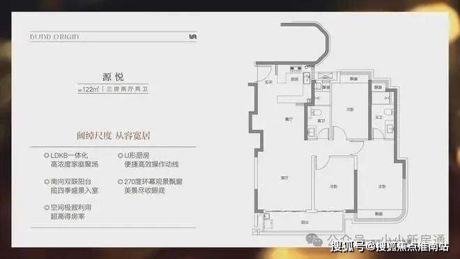 建面约122㎡3房2厅2卫,非常标准的动静分离、三开间朝南户型。几乎保留了前一个户型所有的优势,但在尺度感、私密性和舒适度上又有突破,不管是采光、视野、通风、私密性,还是实用性都十分出色。主卧拥有270度环幕观景飘窗,视野和采光都非常好。
