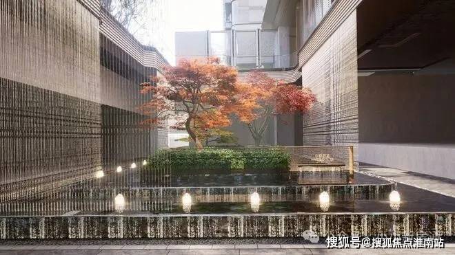 下沉庭院整体长约18米,进深约9.5米,庭院的上下景观通过水帘相连通,中间结合有着层层叠水的水景,搭配水晶砖的景墙,将品质感拉满。