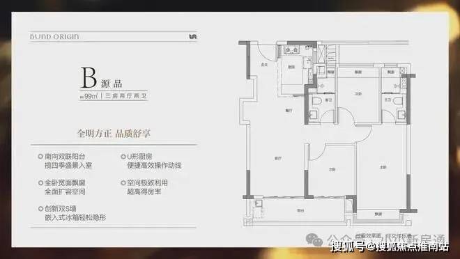建面约99㎡3房2厅2卫,非常标准的动静分离、三开间朝南户型。"分户s墙"设计在分户墙处增设“凹型空间",“冰箱外移"增加厨房操作台面和收纳空间,创造更合理的餐厨桌台动线。三开间朝南+南向双阳台设计+全卧室带飘窗,为整个户型带去非常出色的采光,同时室内视野的延展性很强。动静分离则是把功能区与休息区分割,加上主卧套房的设计,让业主有更好的私密性和生活舒适度。