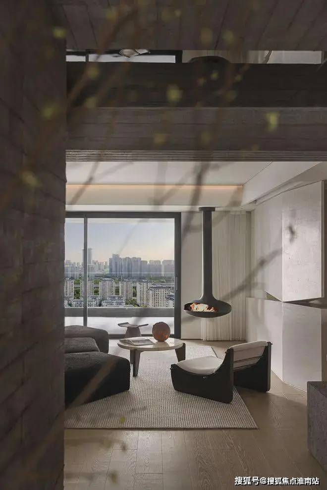 客厅的原建筑是下沉式设计,通过朴实的原木踏步与地面过渡相连,与其他空间产生了视觉上的落差,营造出丰富的层次感。因空间较为高挑,加上低矮的家具选择,在整个下沉式空间中,尺度被放大,视野更加开阔。