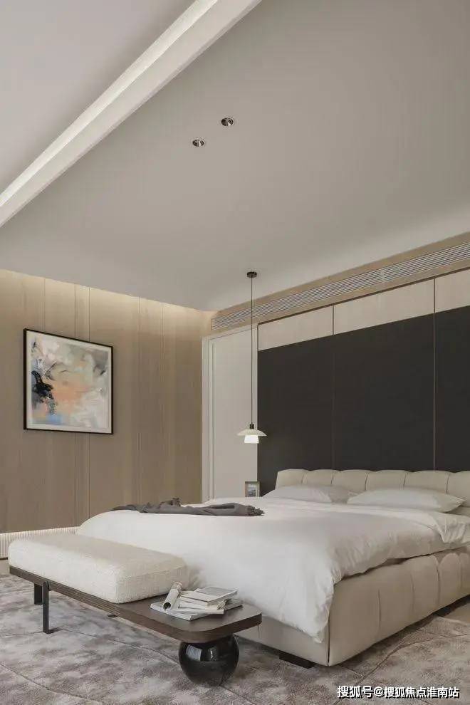 坡形顶的设计不仅提高了空间的视觉高度,也增加了空间的层次感和个性化艺术美感。通过巧妙隐藏空调风口等设备,整体空间变得简约干净。