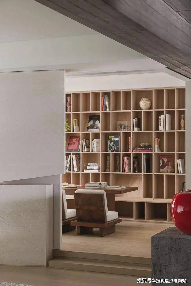 在视觉统一的图景前,窥见多层透景,点缀黑白分明的大理石纹理,深化木饰面的自然性,演绎主次协调的气韵。将收纳空间隐藏于平整柜面之内,模糊柜形与墙壁的区别,烘托出静谧的阅读氛围。线性台灯象征思绪,竹节桌腿彰示修养与气节。