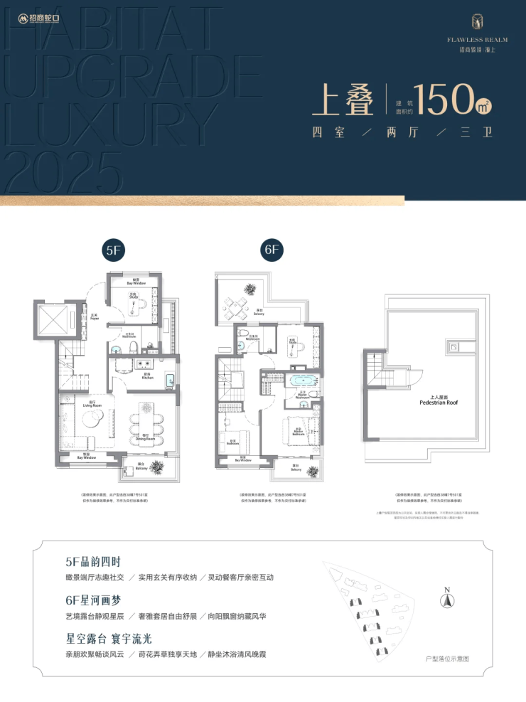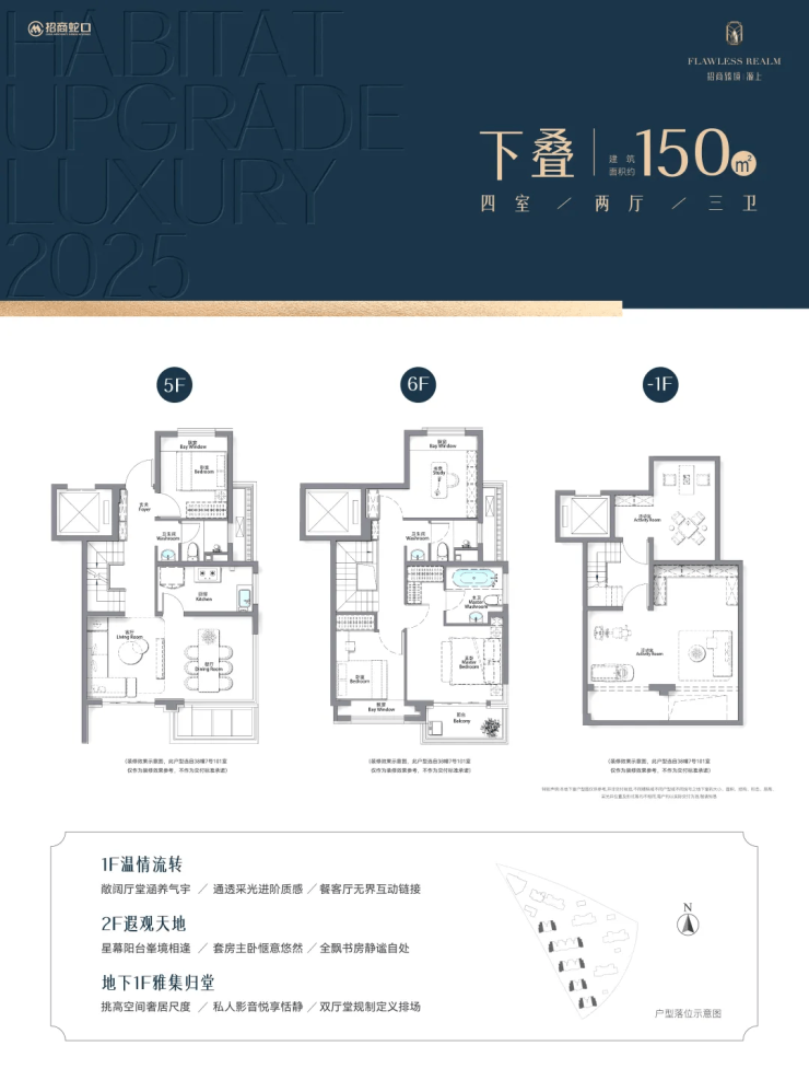145–152㎡四房两厅三卫(叠墅):下叠附赠地下室(层高5.5米),上叠带星空露台,得房率高达77%