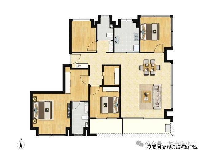 该户型四开间朝南,阳光满溢;整体4房布局,满足二胎家庭/多代同堂需求。