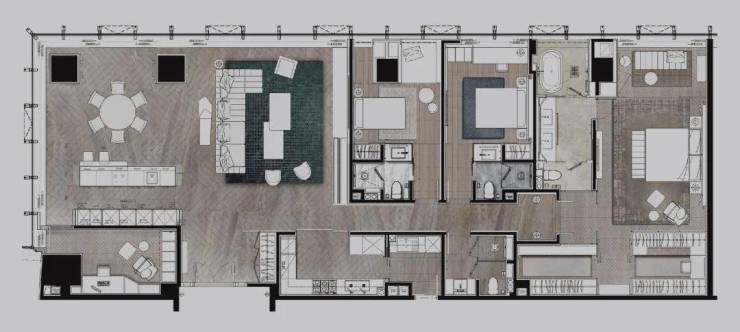 项目从ONE57等全球顶级大平层豪宅中汲取精装理念,整合全球矜贵资源,与Gaggenau、Miele等国际奢装品牌联合定制,以大师造诣精装呈现奢华品味。
