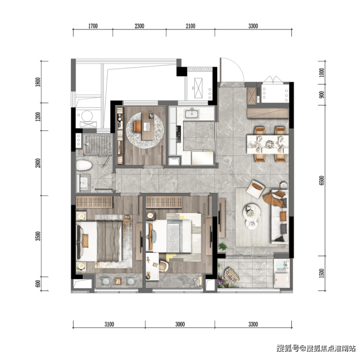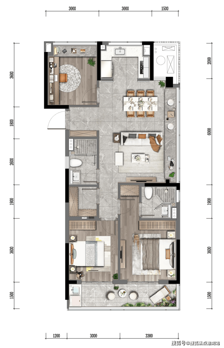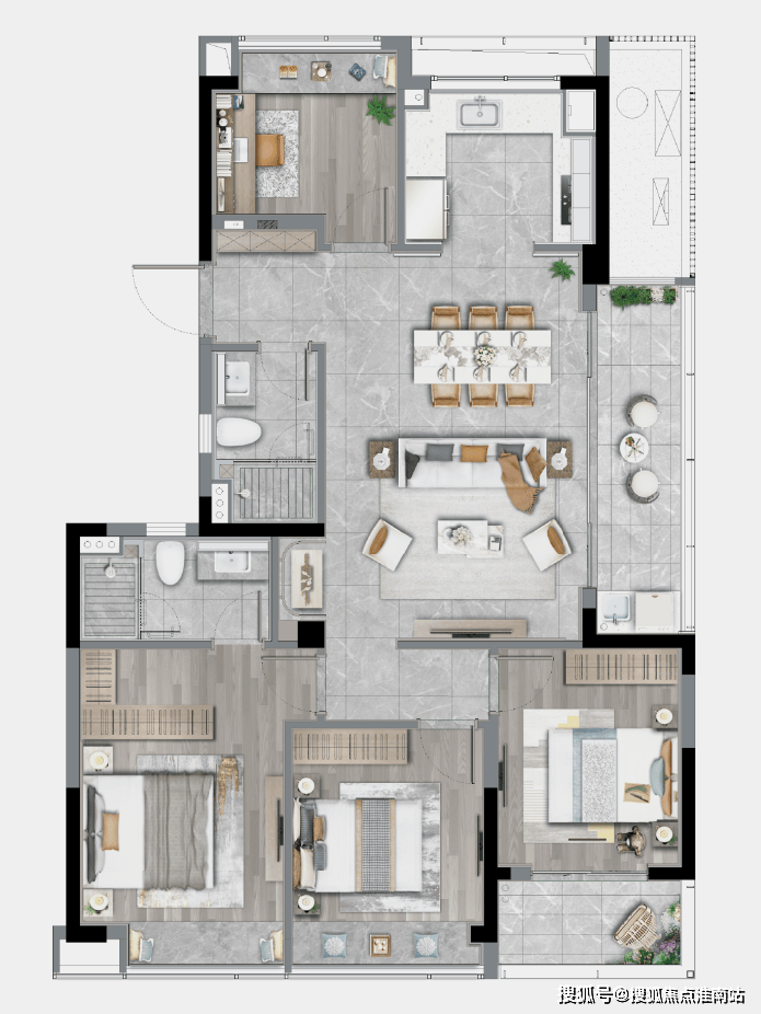 LDBK一体化的公区,充分实现了家庭成员间的互动;除了边厅外接的阳台外,南向次卧同样设计了阳台,兼顾了景观和晾晒的需求。