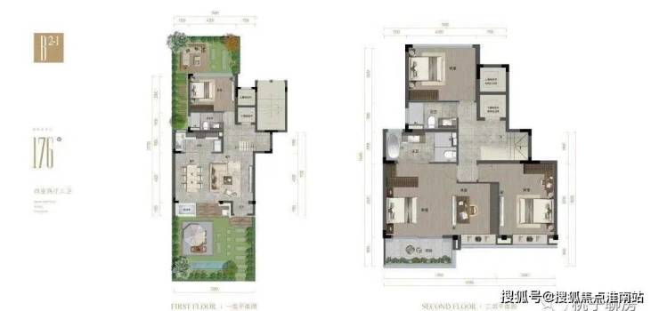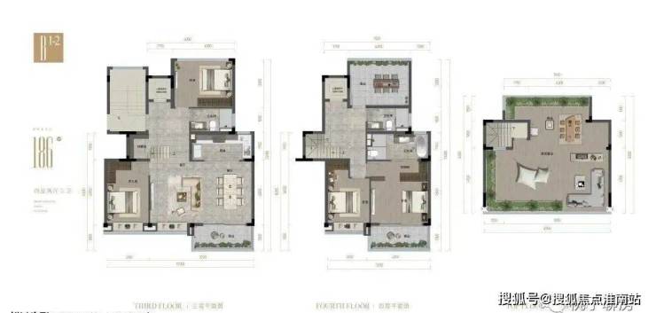 约186㎡上叠,三层是餐客厅和书房,带储藏间和观景阳台,四层是两个套房,主卧套房配超大衣帽间,尽显主人奢华气质;