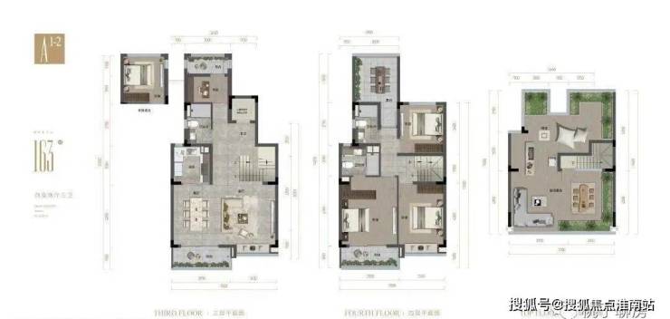 约163㎡是3室2厅3卫的上叠,南北观景双露台,三层是休闲区,双套房设计,动静分离,空间阔绰。