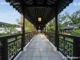 社区门庭由圣罗兰奢石、白雪公主透光玉石、玉曼米黄大理石,搭配深咖色定制纹样金属打造,气势磅礴!门庭内「水韵莲径」架空走廊以石材景墙与金属格栅构成曲径通幽的通道,极具东方韵味~
