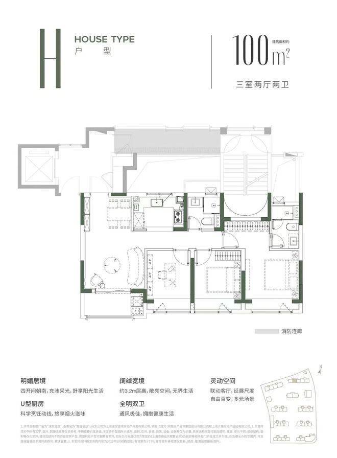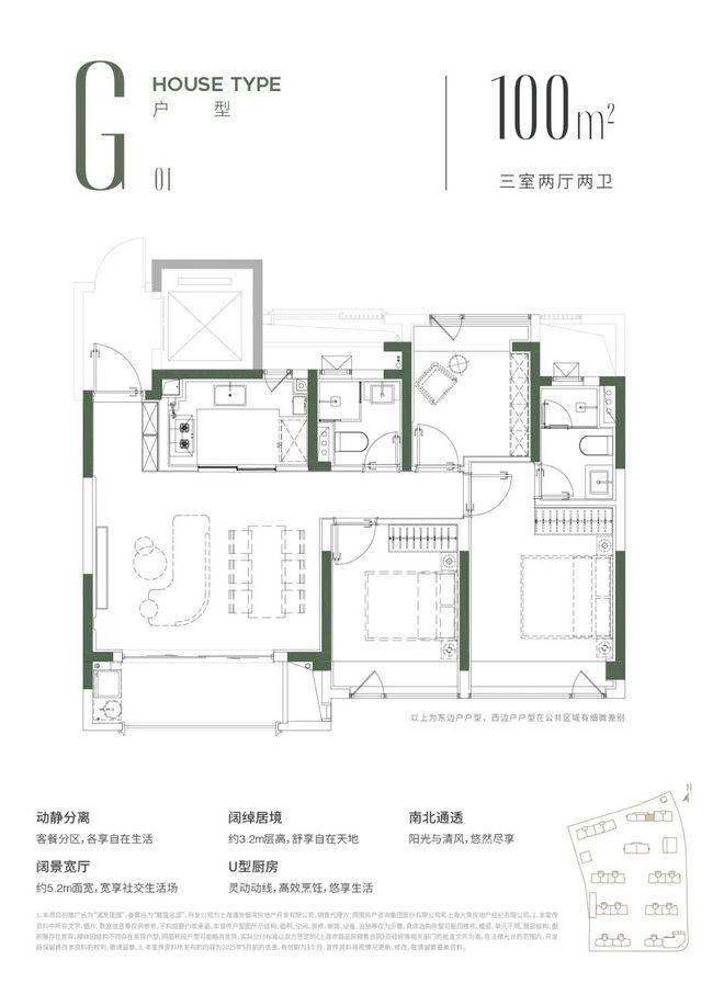 约100㎡三房两厅两卫(H/G户型,四开间朝南/5.2米横厅)