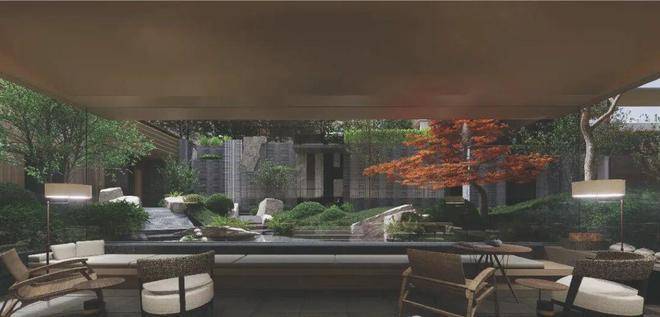 中央水韵庭院以「叠水莲池」为理念打造多层次的水景体系,叠水瀑布形成动态的水流韵律,池畔大理石打造的休憩长桌,成为被绿意环抱的林下空间,氛围相当惬意~