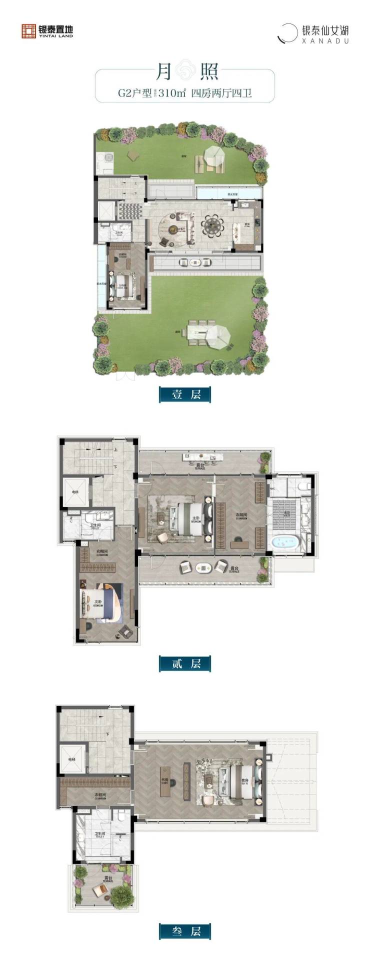 地上三层(一层3.4米、二层3米、三层2.9米+坡屋顶),地下一层(层高3.2米-6.8米)独门独户,拥有无数人垂涎的前庭、后院生活,将仙女湖畔的深林与小径美景延伸到园里来,开启庄园般的自在奢享。