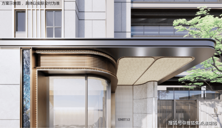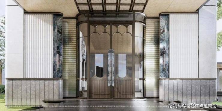 在楼栋主入口同样运用 石材+弧形铝板等元素,同时还有格栅装饰,质感提升明显: