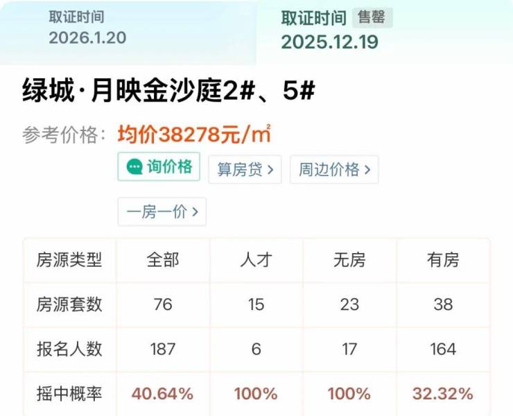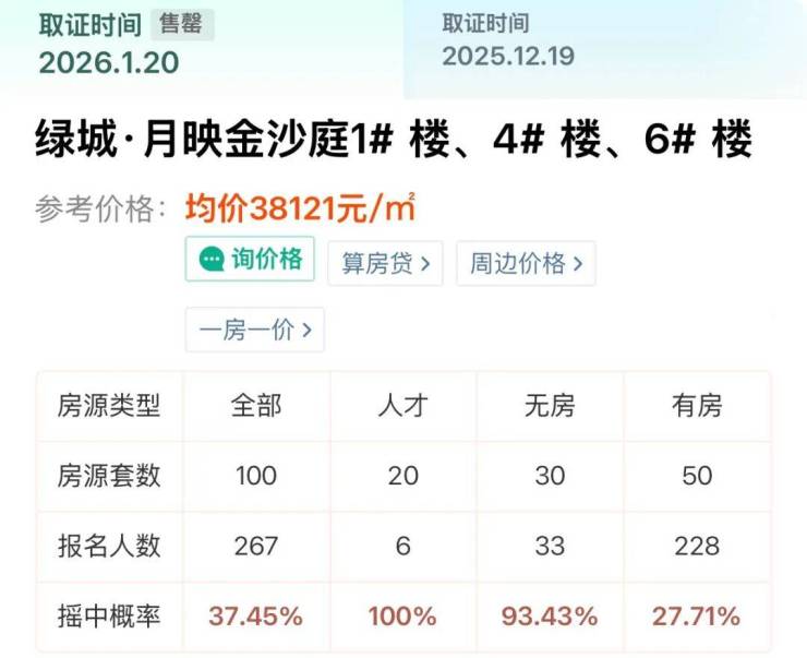 ● 二开(100套):267组抢购,有房家庭中签率27.71%;