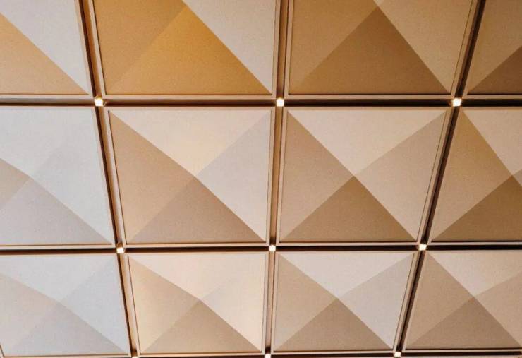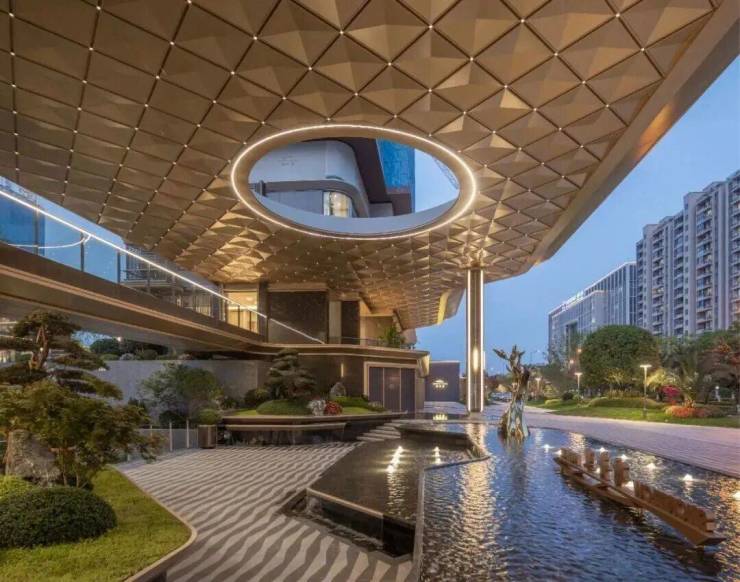 示范区入口处的雨棚吊顶是该项目的一大亮点。铝板们经过固定角度的弯折设计变得凹凸有致,依次铺排之后呈现波光灵动,削弱几何图形“一板一眼”的刻板影响,折射“艺术”所承载的美轮美奂。