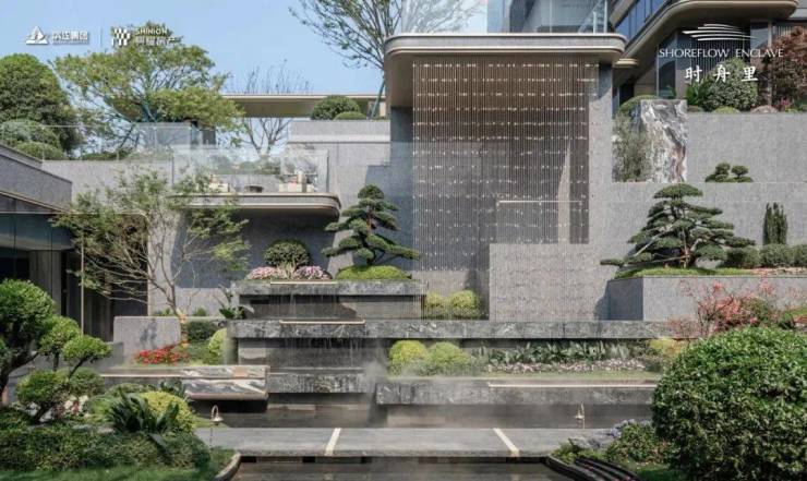 其中下沉水院作为关键归家场景之一,以水为引,叠瀑飞流,对景廊架,还有风景连廊,搭配波光粼粼的镜面水景和绿植点缀。