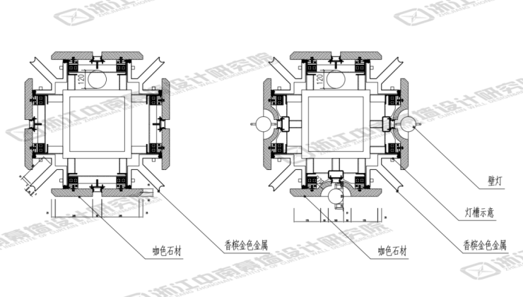 立柱部分同样经过设计师精心构造,咖色石材与香槟金色金属拼配,保持视觉色彩统一又富有层次;弧形设计预留壁灯及灯槽位置,白天时段观望典雅中略带复古,夜幕降临后,灯光与之完美融入,毫无突兀也未有违和。