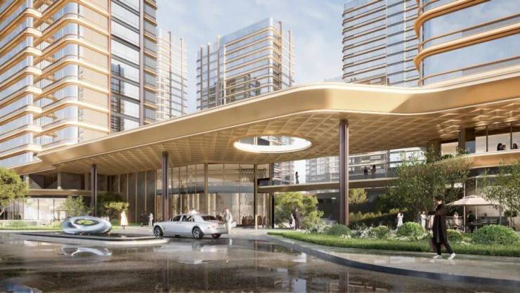 以约70米宽的尺度,约9米高的鎏金天幕铺开。跨过这道门后,越往里走,越感受到未来绿城的水准。