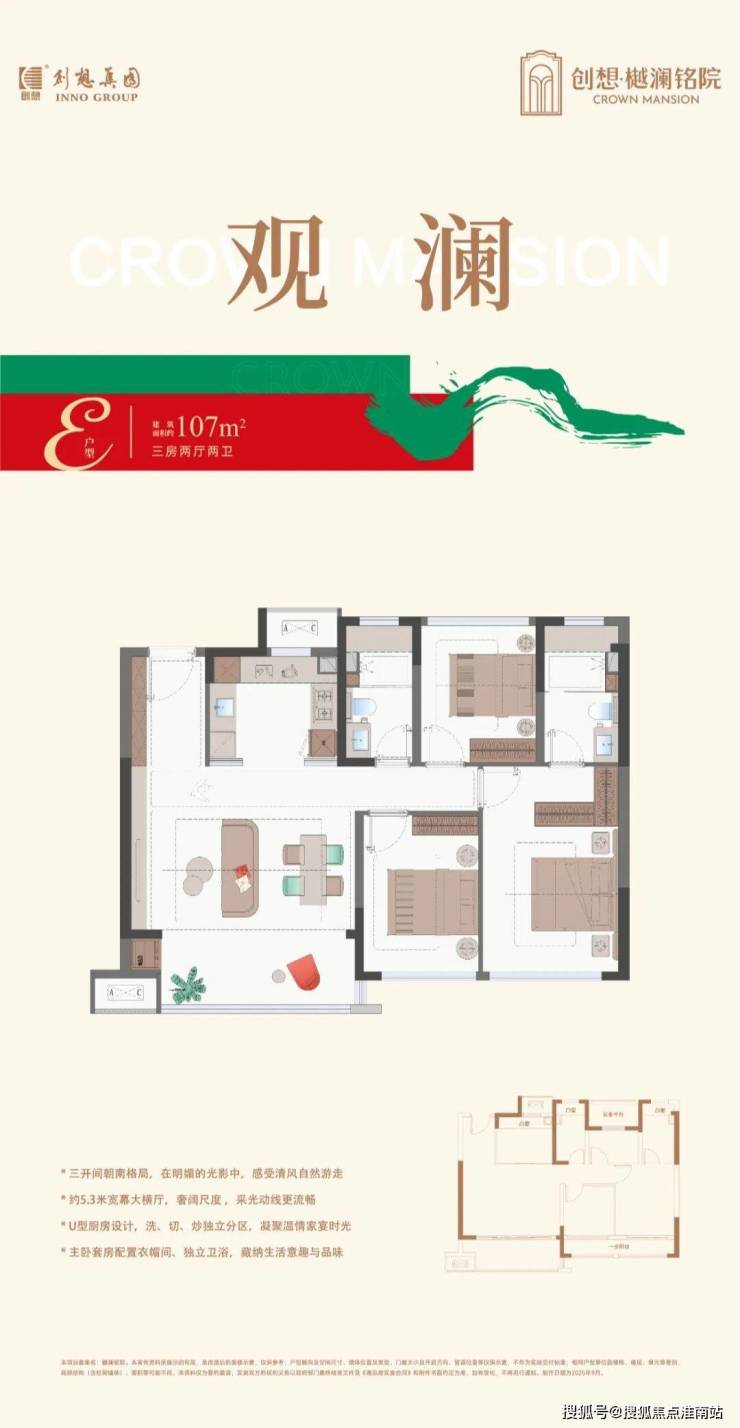 它的户型起步98㎡,也是创想为年轻人全新研发的一款户型。奢阔横厅+3开间朝南+主卧套房设计+主次卧的一步阳台+超大的U型厨房,演绎N种美好的可能!