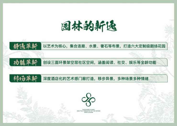 汲取国际高奢度假酒店理念,打造“六大度假花园+五重景观空间”,打造洄游的空间体会,结合泛华所的三面环景境界,将“静谧奢享”贯穿始终,让酒店式景观园林与江浦公园绿意形成无界衔接。