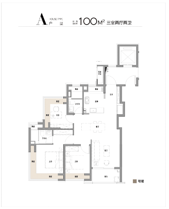 100㎡户型,双270°飘窗设计(南向主卧+北向书房),南次卧、厨房、双卫飘窗,厨房烟道外移,飘窗配置抽屉,极致空间利用率。