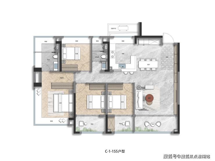 建面约155㎡的顶奢4房产品,四开间朝南,三间卧室全朝南。