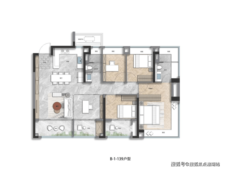 建面约139㎡4+1房户型,四开间朝南+4飘窗+2个约270°转角飘窗,不管是从什么层面来看这个户型,在市面上都几乎是没有对手的。