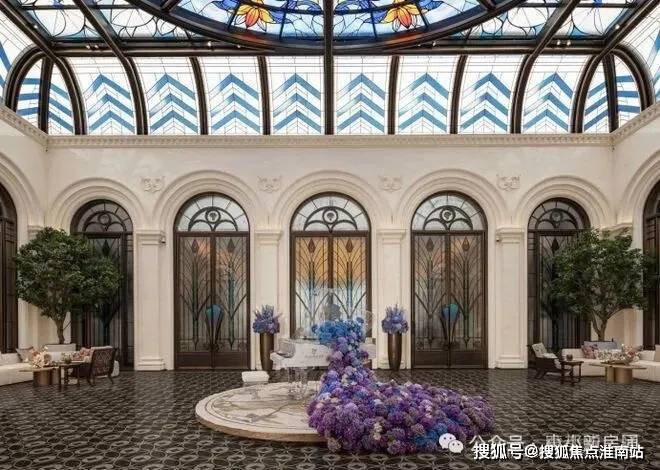 彩绘玻璃穹顶漫射柔和天光,艺术拱门与浮雕墙面交替排列,中央紫蓝渐变花艺装置描摹四季流转之美,可上演私享音乐会、业主演说会、亲子读书会、浪漫下午茶等,复现百年和平饭店的顶层社交场景。