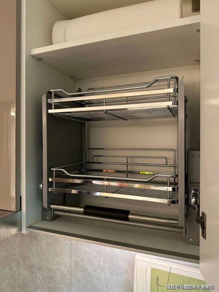 橱柜作为强功能性的收纳系统,自然少不了操作性能上的考究,吊柜做了 升降式的拉篮, 以后再也不用爬上高凳拿取了。