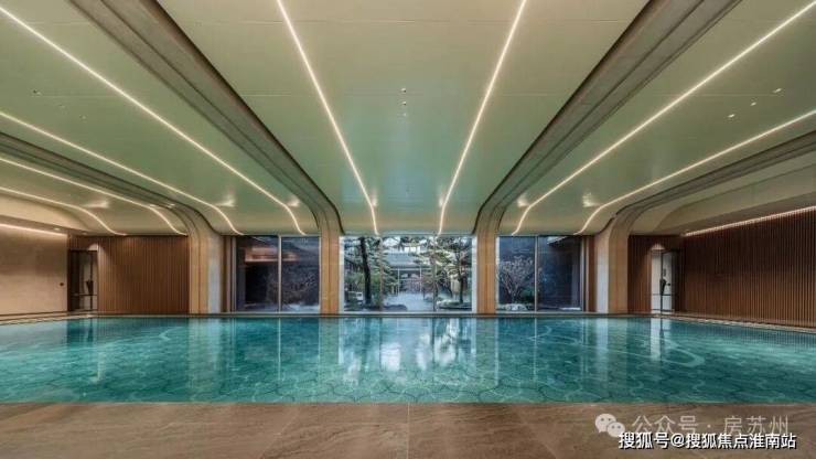 水面与地面齐平相接,消弭视觉边界。顶面灯带如银河倾泻,柔光均匀铺洒水面,一面落地窗正对庭院盛景,尽享休闲奢华。